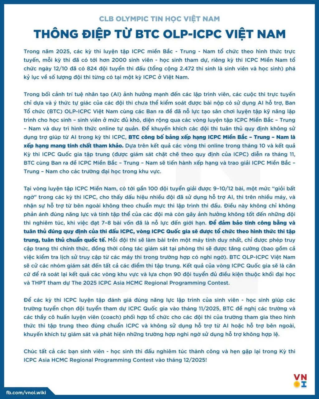 Các đồng chí lưu ý trong quá trình ôn/thi không sử dụng AI để tránh việc lười tư duy thuật toán và tránh bị cảnh cáo từ BTC. Thanks!